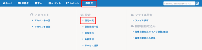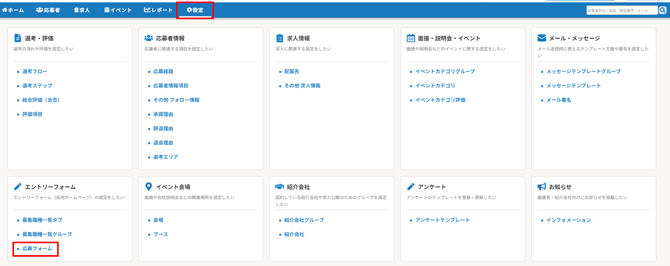 1.メインメニュー>設定>設定一覧>応募フォームをひらきます。
