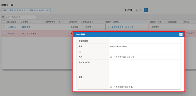 応募者に紐づいていないメールは、以下の操作を行うことで応募者に紐づけることができます。(応募者に紐づくと、応募者情報画面の「メール送受信履歴」タブに対象のメールが表示されるようになります)
