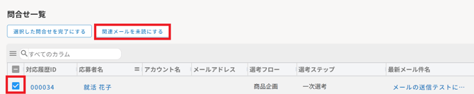 ※紐づくメールのうち一部を未読に戻したい場合は、応募者情報一覧「メール送受信履歴」タブより操作してください。