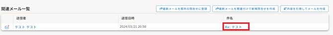 受信した新着メールが、すでに登録済みの問合せに関連がある場合、登録済みの問合せに追加する事ができます。追加登録しておくことで、関連メールを一元管理する事ができます。