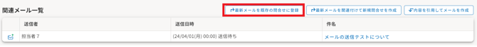 2.関連メール一覧でメール内容を確認し、〔最新メールを既存の問合せに登録〕をクリック。