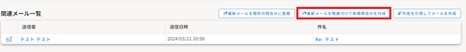 2.関連メール一覧でメール内容を確認し、「最新メールを関連付けて新規問合せを作成」をクリック。