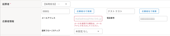 応募者情報欄のメールアドレスが、未入力の場合、送信時に「メールを送信する場合は、メールアドレスを入力してください」とエラー表示され、送付することができません。