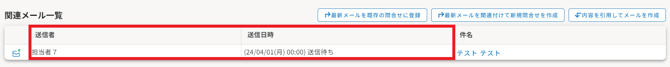 関連メール一覧に送信日時が反映され、送信したメール本文も確認できます。
