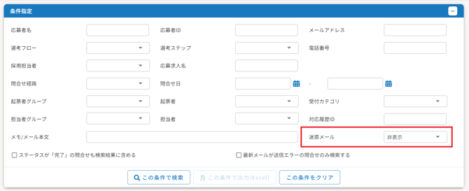 3.検索項目「迷惑メール」を空欄もしくは迷惑メールのみ表示するを選択して検索します。