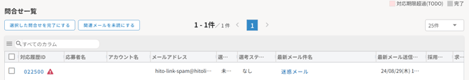 迷惑メール疑いがあるメールには対応履歴IDの横に⚠️のアイコンが表示されます。