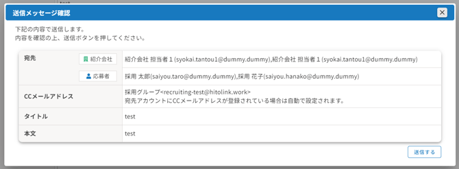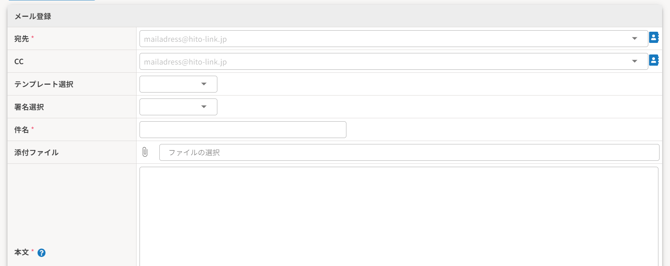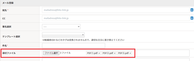 宛先を入力してください。 ※「内容を引用してメールを作成」の場合は自動的に「応募者情報のメールアドレス」が反映されます。 |