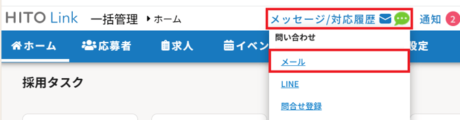 1.ホーム画面上〔問合せ未対応〕をクリック、もしくは、ホーム画面右上の〔メッセージ/対応履歴〕にカーソルを合わせて表示されるメニューから〔メール〕をクリックします。