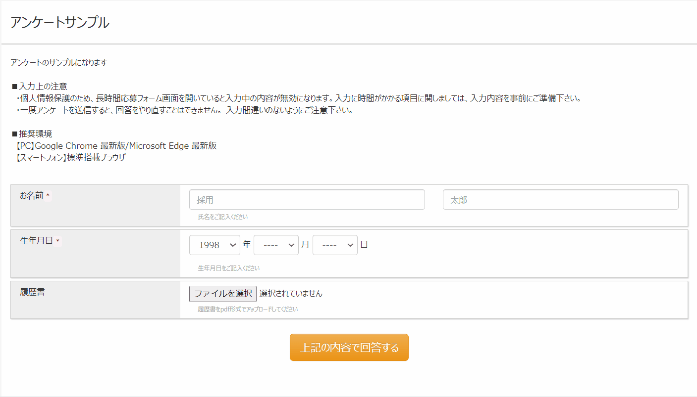 応募者に送信した回答用URLからアンケートに回答してもらうことで、確認したい情報を収集することができます。