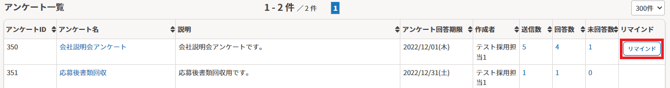 1.アンケート一覧で、リマインドを送りたいアンケートの〔リマインド〕をクリックします。