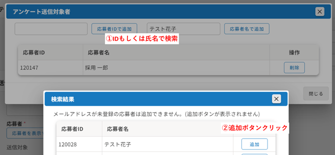 3.追加したい応募者をIDまたは応募者名で検索し〔追加〕ボタンをクリックすると、送信対象者に追加されます。その後〔閉じる〕で画面を閉じます。