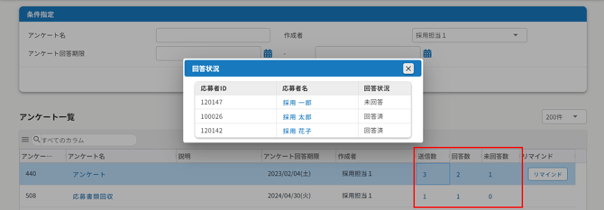 〔送信数〕〔回答数〕〔未回答数〕をクリックすると、応募者名や回答状況が確認できます。