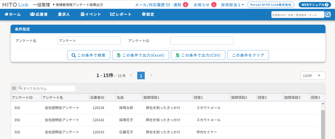 4.回答結果を確認します(応募者毎の確認、Excel / CSVによる一括出力が可能です)