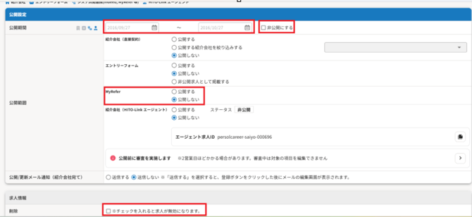 求人作成時にMyReferの公開範囲を「公開する」にして登録した場合、MyReferへ自動的に求人が連携されます。(20分毎)