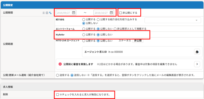 公開期間を入力します。求人自体を非公開にしたい場合は「非公開にする」にチェックをいれます。 |