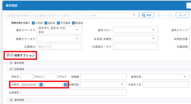 応募日を空白にした状態で検索してしまうと、検索対象となる応募者数が多くなることでシステムに負荷がかかったり、システムダウンの原因となってしまうことがあります。
