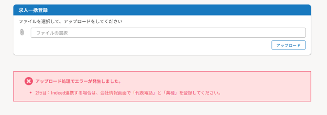 アップロードボタンをクリックした後に画面にエラーメッセージが表示されている場合は、正しくアップロードができていません。エラー内容を確認し、Excel ファイルのエラー箇所を修正して再度アップロードをお試しください。