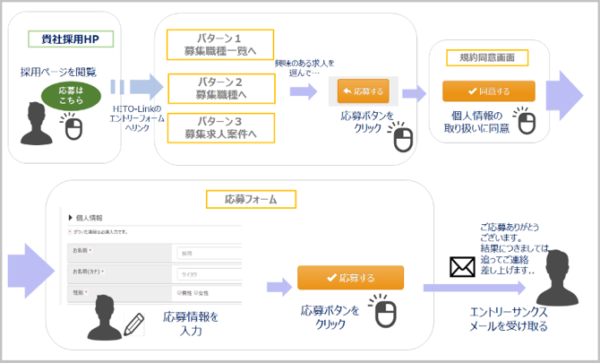 応募者が、貴社採用HPなどから応募が完了するまでの流れは以下のようになります。