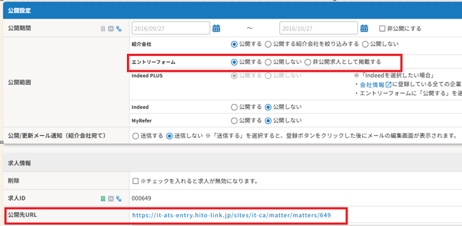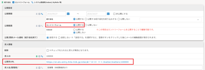 エントリーフォーム公開中の求人ごとに「公開先URL」が発行されます。求人登録画面