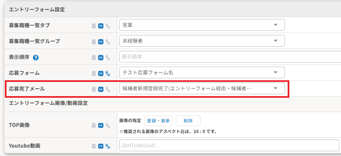 「エントリーフォーム設定」欄の「応募完了メール」で設定したいメッセージテンプレートを設定します。