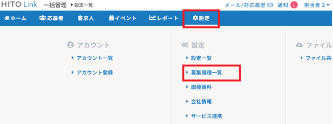 ①メインメニュー>設定>募集職種一覧 を開いてください。