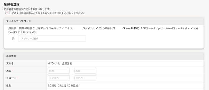 ▼〔求人に応募する〕 を押下すると、応募者情報入力画面が表示されます。
