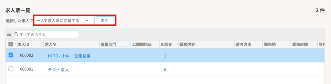複数の求人に一括で推薦したい場合は求人にチェックをつけて「一括で求人票に応募する」を選び〔実行〕を押下してください。