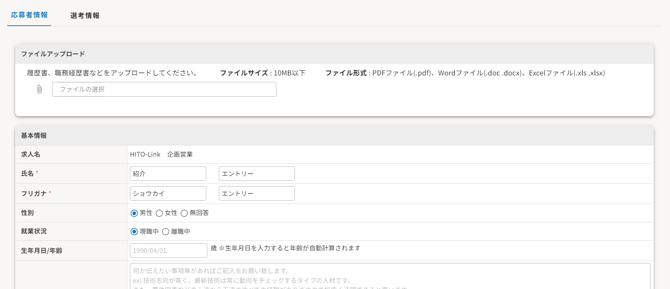 ▼応募者名をクリックすると、その応募者の詳細画面が表示されます。