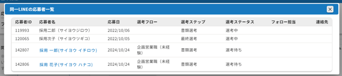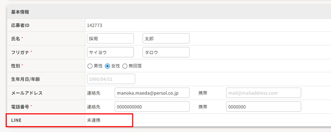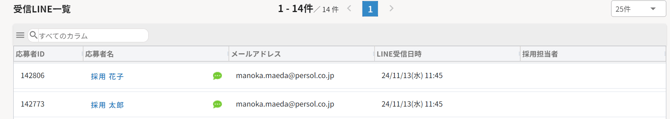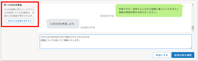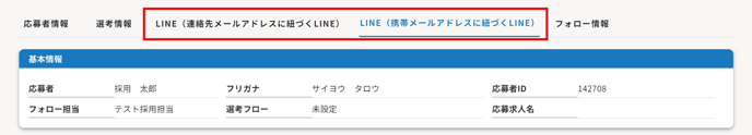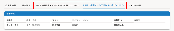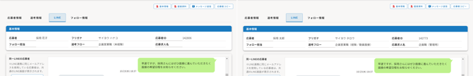 どちらの応募者のページでもLINE連携済みになり、LINEタブが表示されます。メッセージの内容もリンクします。
