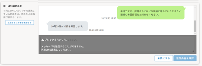 LINEは未連携になり、メッセージを送信できなくなります。応募者がブロックを解除しても自動的に再連携はされません。再度、応募者に友達登録してもらう手順を行ってください。