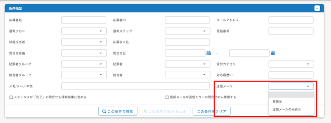 条件指定の〔+〕をクリックして、「迷惑メール」項目で空欄を選んで〔この条件で検索〕をクリックしてください。