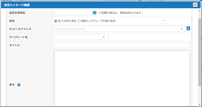 • 宛先が複数の場合<#紹介会社担当者名#>のタグは確認画面では置換されていませんが、実際に送信したメールでは紹介会社の担当者名に置換されます