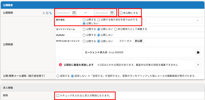 求人自体を非公開にしたい場合は「非公開にする」にチェックをいれます。