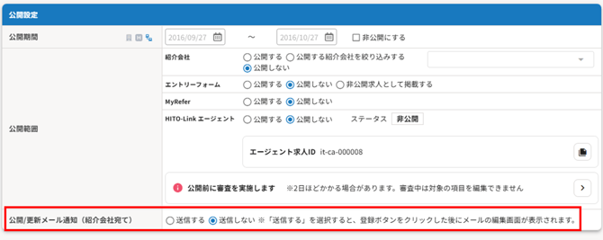 公開/更新メール通知(紹介会社宛て) 送信する:求人情報の公開・更新通知が紹介会社担当者へ送られます。