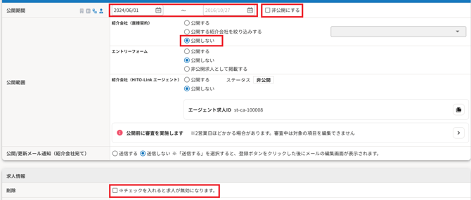 - 紹介会社(直接契約)に公開するためには以下設定が必要です