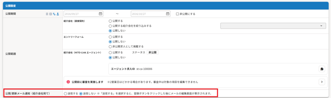| 公開/更新メール通知(紹介会社宛て) | 送信する:求人情報の公開・更新通知が紹介会社担当者へ送られます。 送信しない |