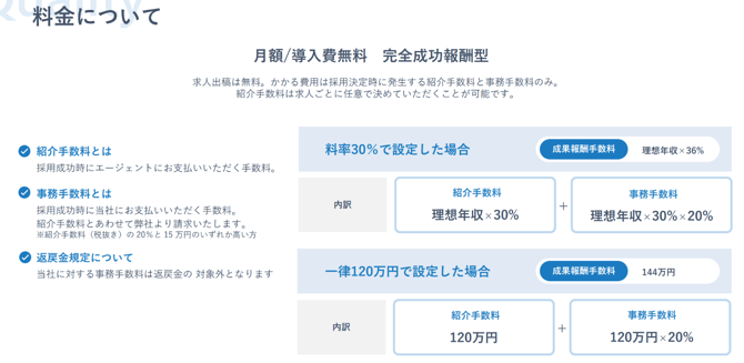 求人掲載は無料です。完全成果報酬で、入社したら紹介手数料と事務手数料が発生します。