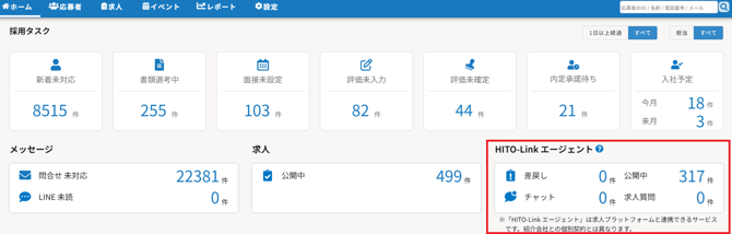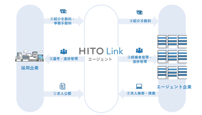 採用企業は求人をHITO-Linkエージェントに公開すると、HITO-Linkエージェントと契約している紹介会社から推薦を受けられるようになるサービスです。