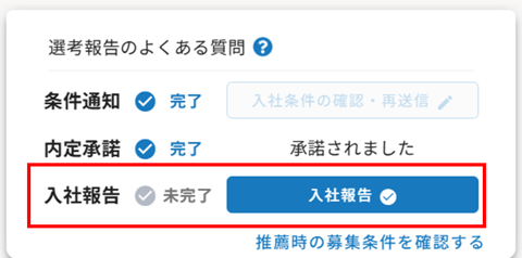HITO-Linkエージェント経由の応募者の場合、成約手数料およびHITO-Linkエージェントの利用手数料の支払いのため、HITO-Linkリクルーティング上で条件通知および入社報告を行っていただく必要があります。