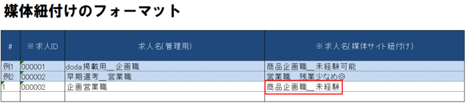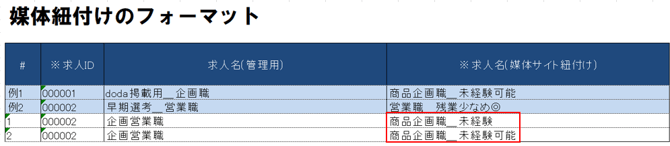 - 「媒体紐付けアップロードフォーマット」では、求人名(管理用)の更新はできません。「求人アップロードフォーマット」をご利用ください。