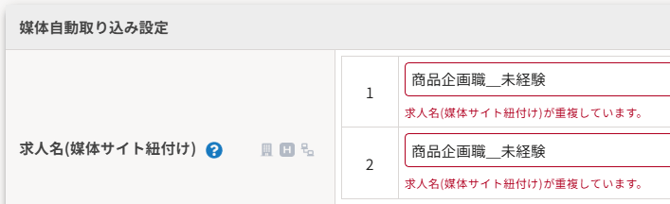 - 1つの求人に対して、同じ名称の求人名(媒体サイト紐付け)を複数登録することはできません。空白でのご登録もできません。
