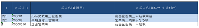 - 一括で求人を新規登録し、かつ、求人名(媒体サイト紐付け)も登録したい場合には上記2つのフォーマットをご利用いただくこととなります。