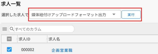 該当の求人にチェックを入れ、「媒体紐付けアップロードフォーマット出力」を選択し、〔実行〕をクリック。媒体紐付けアップロードフォーマットを出力します。