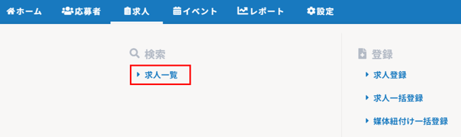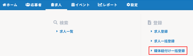 メインメニュー>求人>媒体紐付け一括登録 をひらきます。