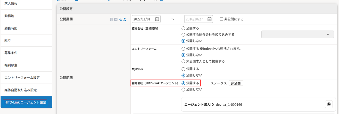 - 公開範囲の「紹介会社(HITO-Linkエージェント)」を公開する にした場合のみ、求人画面でのHITO-Linkエージェントの設定が可能です。