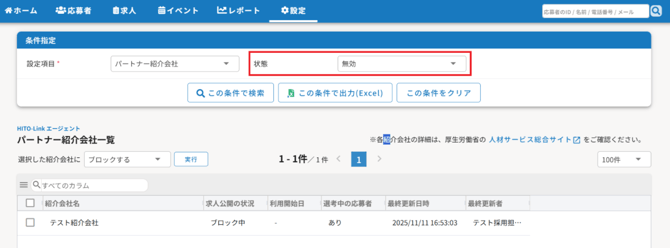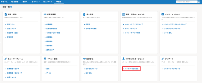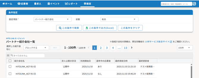 設定>設定一覧>パートナー紹介会社にて、HITO-Linkエージェントのパートナー紹介会社一覧を確認することができます。