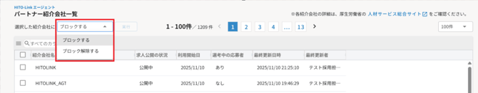 対象の紹介会社を選択>「ブロックする」を選択>「実行」ボタンをクリック