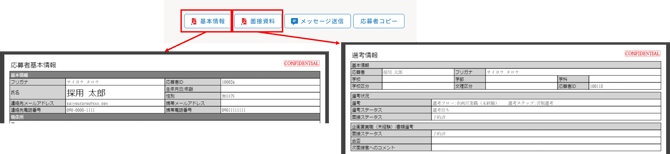 〔基本情報〕で、応募者情報タブの情報をpdfでダウンロードすることができます。また、〔面接資料〕は面接時に面接官に確認してもらう資料として使用できます。
