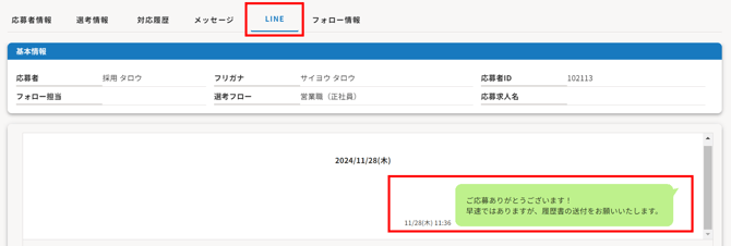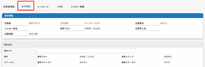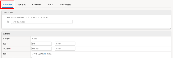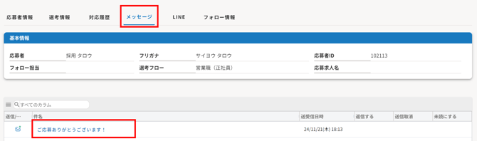 「メッセージ」は、この応募者に紐づくメッセージや問合せが登録されたら、タブが表示されます。