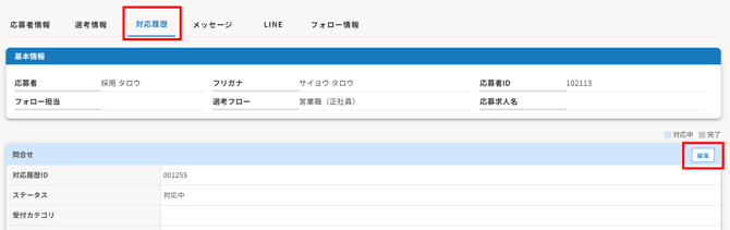 「対応履歴」は、この応募者に紐づくメールやTODO/問合せが登録されたら、タブが表示されます。